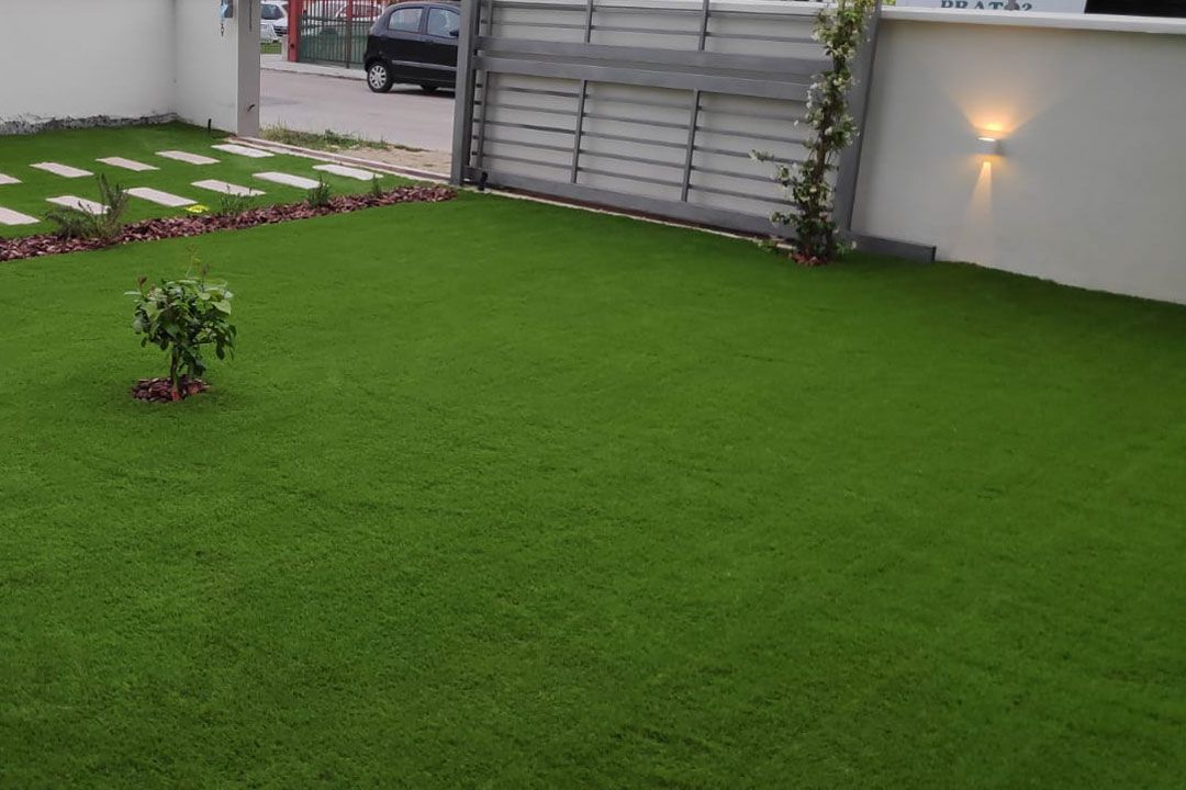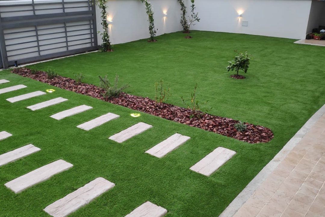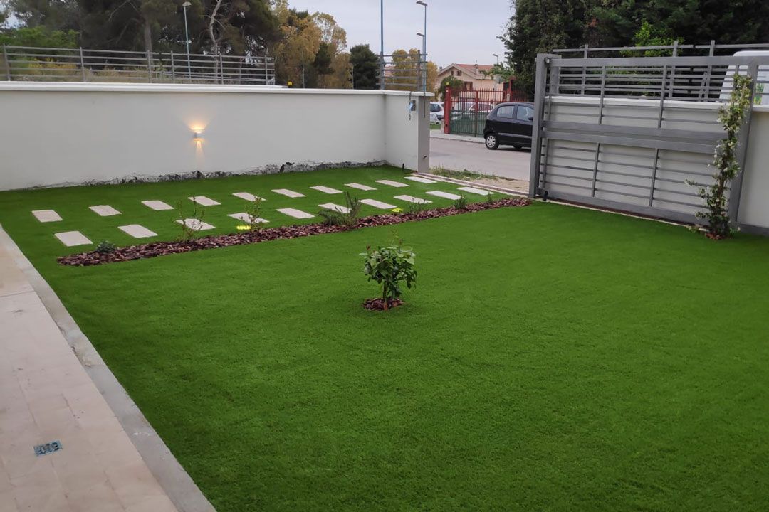 Un giardino dalle forme regolari reso spettacolare dal nostro bellissimo prato e dall’inserimento dei nostri camminamenti “Travetto Ivory”, dall’impianto di illuminazione installato a filo prato e dalla striscia trasversale in corteccia di pino, con messa a dimora di piante di macchia mediterranea.